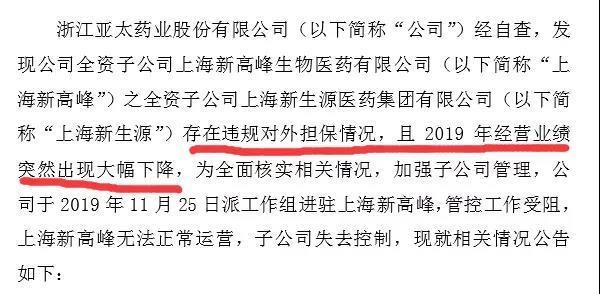 2019年1225日,媒体曝出浙江亚太药业股份有限公司对旗下上海新高峰生物医药有限公司(以下简称:上海新高峰)及其子公司失去控制,无法接管印章。