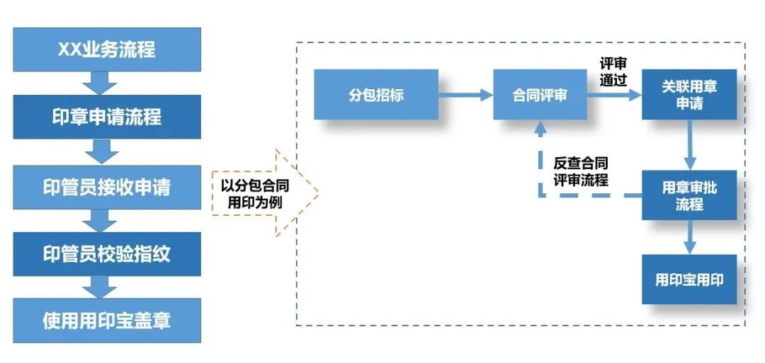 在分子公司和项目部场景中,流程审批通过后印管员或申请人自助盖章,印章使用过程被监控或者远程授权才能使用。