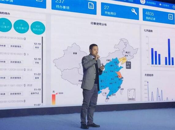 江苏群杰物联科技有限公司创始人兼CEO朱杰应邀出席此次盛会,并在创见-高效管理板块,分享了群杰物联印章物联网整体解决方案。